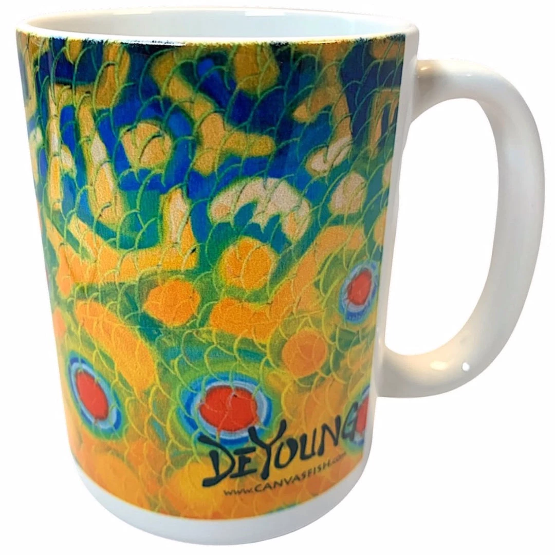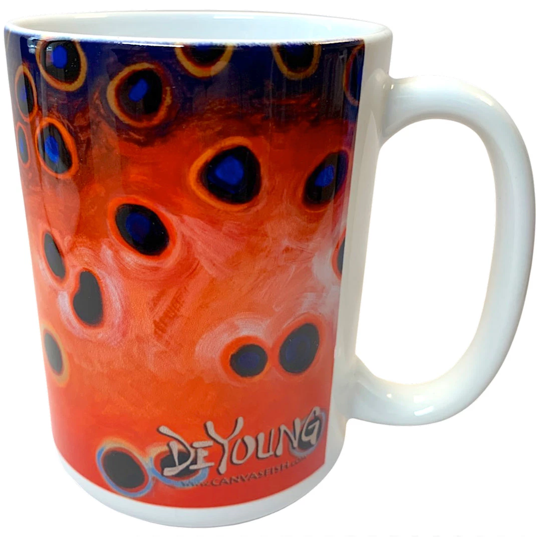 These hefty, 15 oz. fully printed mugs showcase the best of DeYoungโs Abstract Fish Flank Series in bright, vivid detail. Available in Brown, Rainbow and Brookie or Cutthroat. Buy as singles or as sets. Microwave safe, but not dishwasher recommended. Made in the USA.