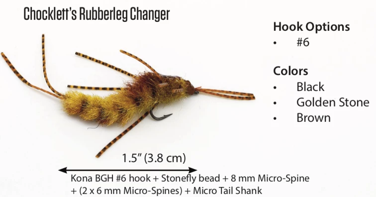 One of the most popular, effective forms of trout fly just got better. Rubber Legs style nymphs have become a staple go-to trout fly especially out West and Chocklett’s Rubber Legs Changer now ups the game by adding unprecedented lifelike movement from its highly articulated 5-segment body tied with the new Articulated Micro-Spinesystem and weighted with a Nymph-Head Evolution Stonefly tungsten beadhead so you can drop it into the feeding zone ASAP.