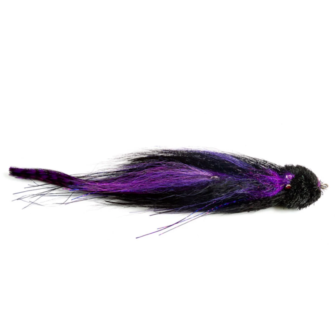 A great color choice in bright sunlight or stained water. Fishes best behind an intermediate or sinking line with quick, aggressive retrieve. Joe’s Electric Grape Muskie Leech is tied on an 3½’’ Fish-Skull® Articulated Big Game Shank©. Overall fly length is approximately 8’’.