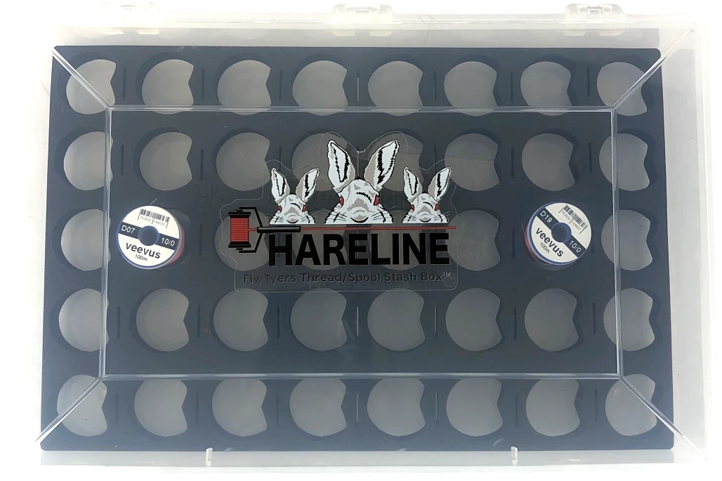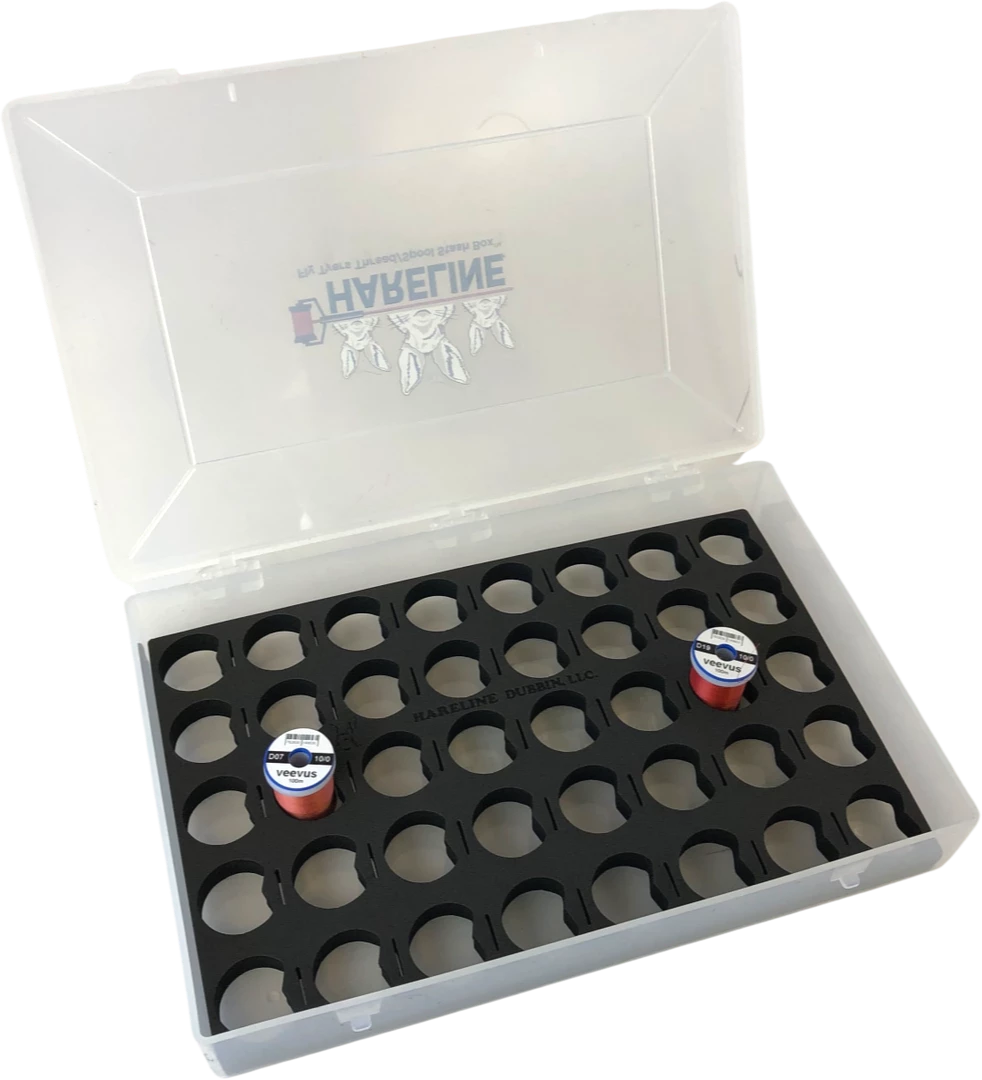 Fly Tyers Thread / Spool Stash Box holds 40 spools. Thread, lead, wire, tinsel, ect will fit in this case. The see thru lid is nice to quickly identify what item you need. This is quickly becoming the most popular way to store thread and spools!