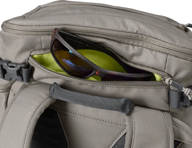 Floatplane, jet plane, truck, drift boat, or your own two feet, this backpack is designed to take what you need and make it easy to find it when you need it. It’s a fishing backpack by design, but it easily crosses over to travel as a carry-on or overnighter. Streamlined design offers top and side-entry access with internal zippered drop pocket and removable divider for gear storage options. Back panel integrated net holder for quick and easy storage for even larger guide nets. External water bottle or rod tube holder with deployable extension to lower rod tube to shoulder height. Shoulder straps feature accessory docking stations and fly patch, plus buckle receivers for compatible Chest Pack (#25FS) and Chest/Hip Pack (#25FT). Padded front pocket accommodates a hydration bladder or laptop and tuck-away hip straps distribute load. Tricot-lined sunglass/phone pocket on top flap. Ridged back panel for increased air flow. Weight: 1 kg/2.2 lbs. In sand. Shell: 100% recycled CORDURAยฎ ECO 600 denier polyester with strategic TPU coating. Liner: 100% recycled 200 denier polyester. Spot clean. Imported.