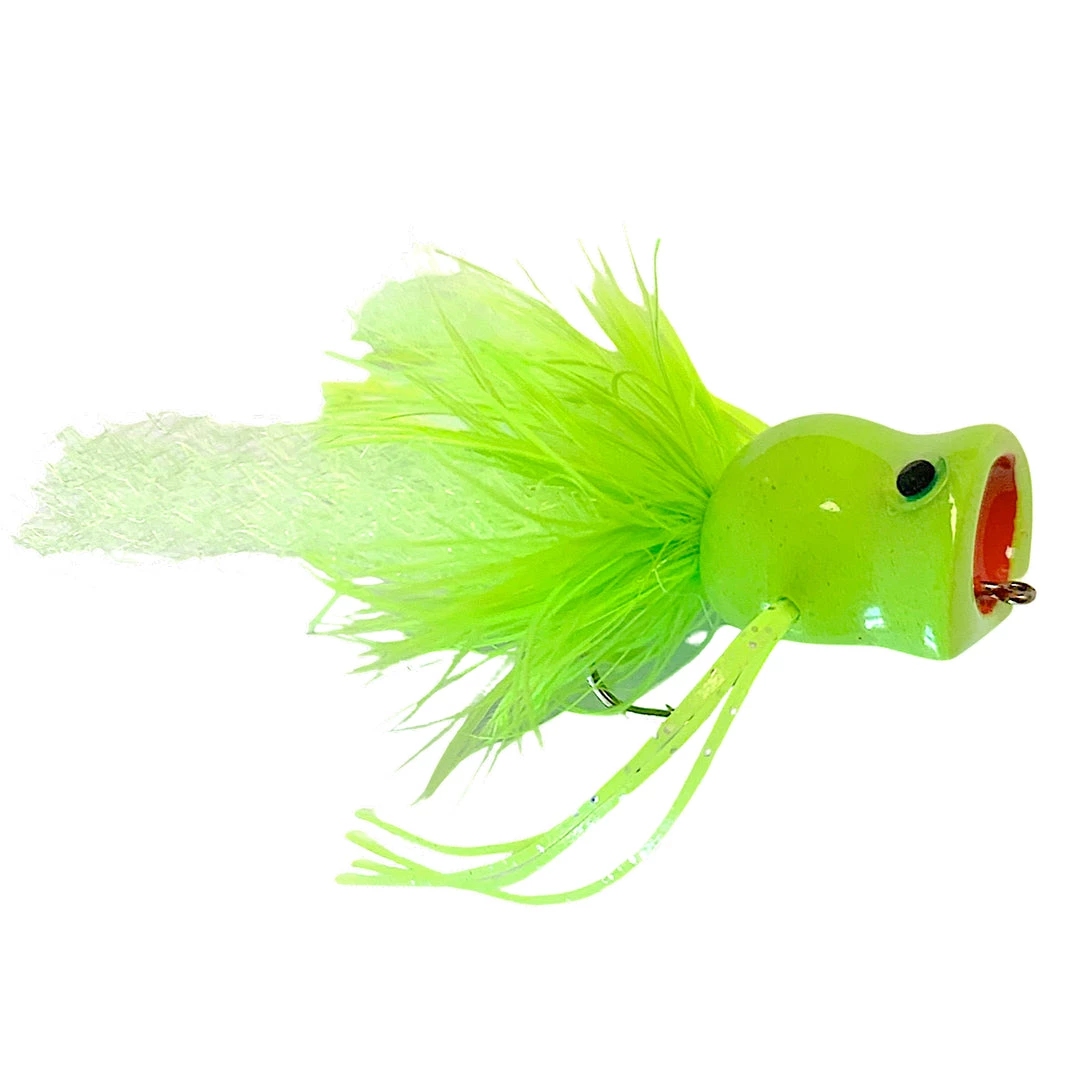 Rainy’s makes some of the coolest warm water patterns on planet earth and this Pot Belly Frog is no exception. Best thrown with a line designed to deliver wind resistant flies and thick leader material. You will need both to turn this fly over at distance but also for the huge bass that will explode on it. The weedguard will help you present it to the fishiest spots in the wood, weeds, or lilypads. Be prepared to have some insane fun with this fly! A short body that still makes a massively loud pop. Entire fly hook eye to tail is around 2.5″ long.