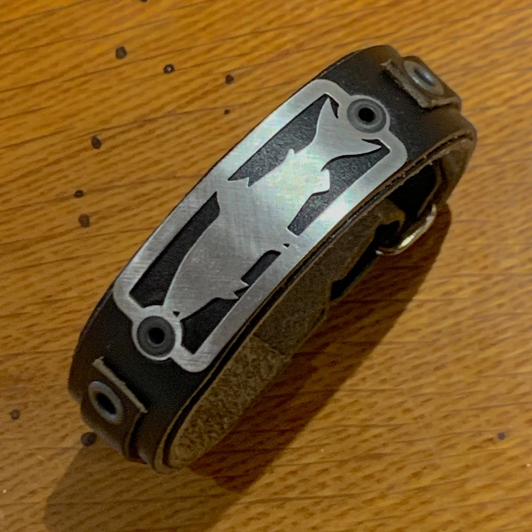 Stainless Steel laser cut badge on Horween Leather. Fastens with “just right” adjustable sizing closure to size down to 6″ or up to 8.5″ wrist.