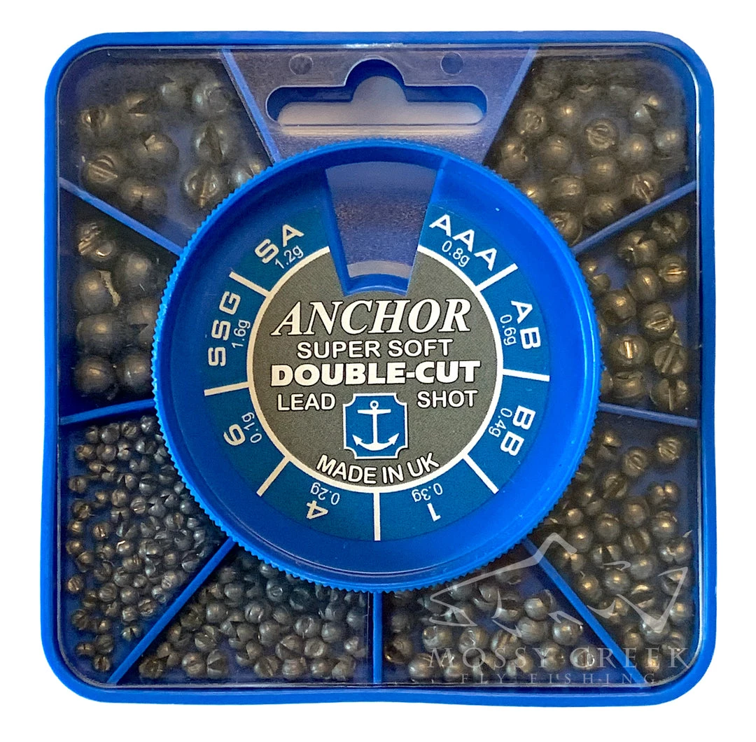Super soft lead split shot with 8 compartments: AAA, AA, BB, 1, 4, 6, SSG, and AAA. Made in England