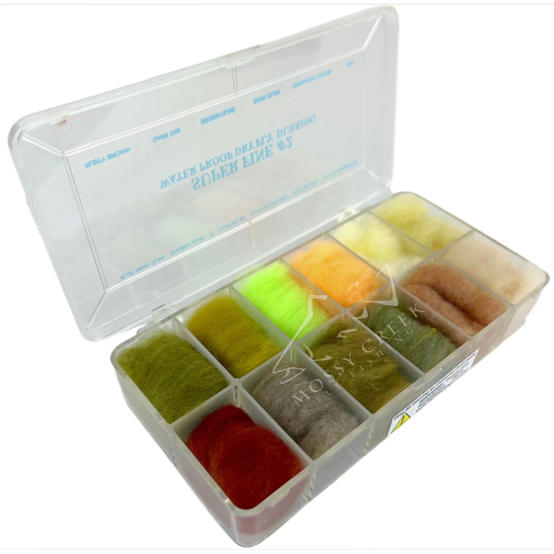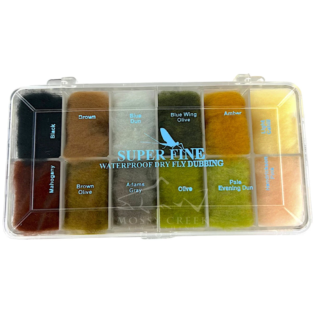Super Fine Dubbing is a permanently waterproofed 1.2 denier, 1.5″ staple synthetic material. It makes fantastic tight bodies on dries past size 28. Great hatch matching colors.